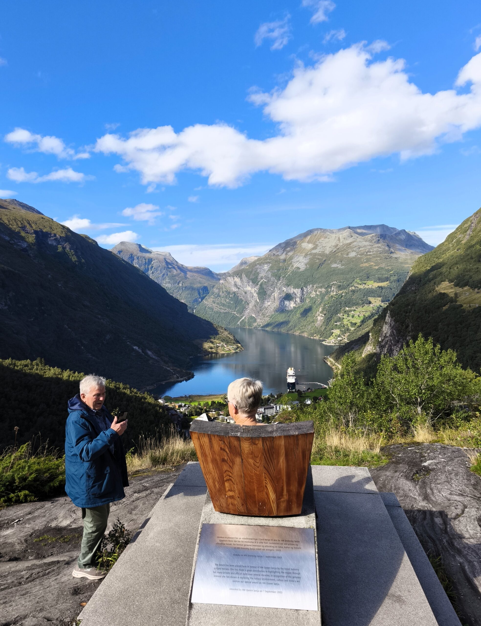 Standing 330 meters above the spectacular Geirangerfjord, Flydalsjuvet offers unforgettable views and incredible photo opportunities. The viewpoint is connected by a charming gangway between two scenic plateaus. Here, you can also visit the famous “Fjordsetet” installation, inaugurated by Queen Sonja, to honour Norway’s breathtaking landscapes.
